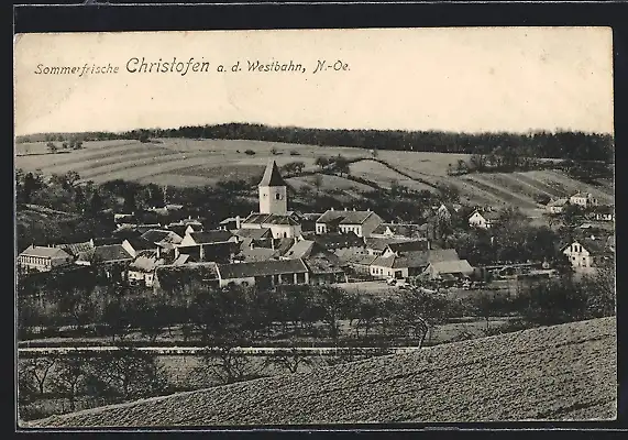 AK Christofen a. d. Westbahn /N.-Oe., Gesamtansicht von einem Berg aus
