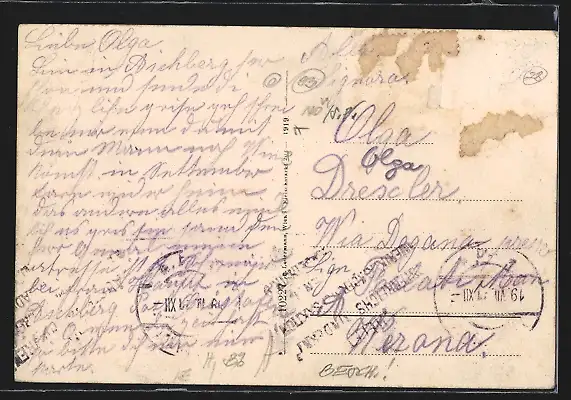 Personenbezogene Daten auf der Rückseite der Karte wurden durch blauen Textmarker unkenntlich gemacht. Die blauen Stellen sind auf die Vorderseite durchgeweicht und wirken sich negativ auf das Postkartenfoto aus