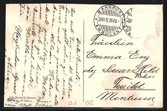 gelaufen 1912, Briefmarke entfernt, rückseitig Oberflächenschaden, re. u. obere Kante beschnitten, guter Zustand