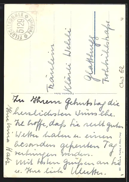 Personenbezogene Daten auf der Rückseite der Karte wurden durch blauen Textmarker unkenntlich gemacht. Die blauen Stellen sind auf die Vorderseite durchgeweicht und wirken sich negativ auf das Postkartenfoto aus