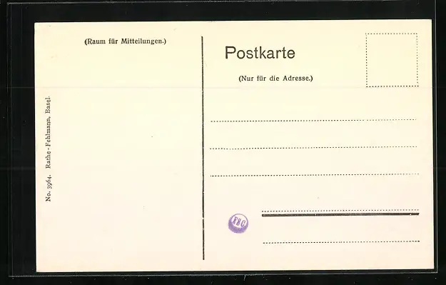Personenbezogene Daten auf der Rückseite der Karte wurden durch blauen Textmarker unkenntlich gemacht. Die blauen Stellen sind auf die Vorderseite durchgeweicht und wirken sich negativ auf das Postkartenfoto aus