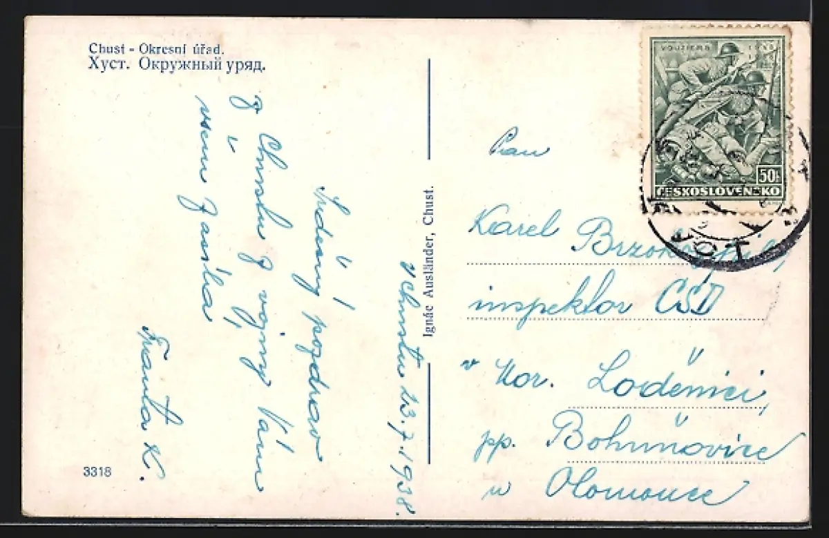 Personenbezogene Daten auf der Rückseite der Karte wurden durch blauen Textmarker unkenntlich gemacht. Die blauen Stellen sind auf die Vorderseite durchgeweicht und wirken sich negativ auf das Postkartenfoto aus