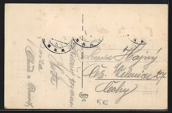 alte Ansichtskarte, gelaufen, Briefmarke entfernt, rückseitig Oberflächenschaden, guter Zustand