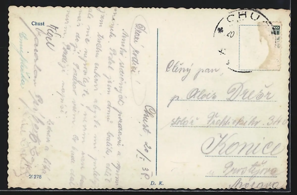 Personenbezogene Daten auf der Rückseite der Karte wurden durch blauen Textmarker unkenntlich gemacht. Die blauen Stellen sind auf die Vorderseite durchgeweicht und wirken sich negativ auf das Postkartenfoto aus