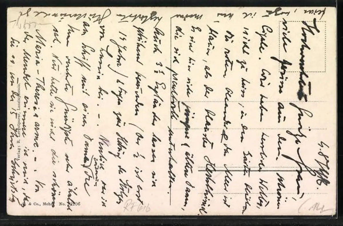 Personenbezogene Daten auf der Rückseite der Karte wurden durch blauen Textmarker unkenntlich gemacht. Die blauen Stellen sind auf die Vorderseite durchgeweicht und wirken sich negativ auf das Postkartenfoto aus