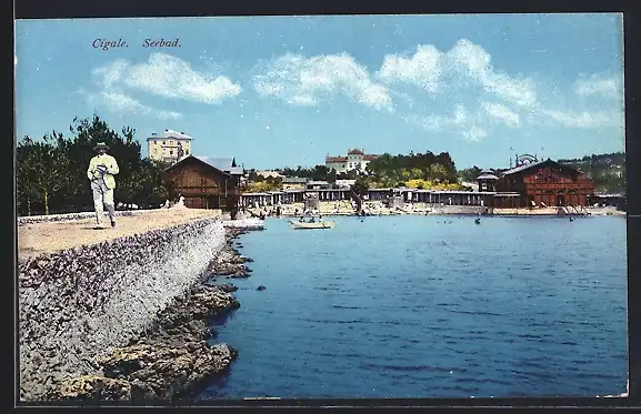 AK Cigale, Seebad mit Spaziergänger
