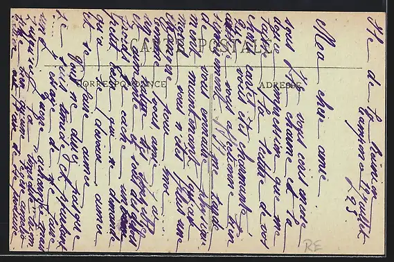 Personenbezogene Daten auf der Rückseite der Karte wurden durch blauen Textmarker unkenntlich gemacht. Die blauen Stellen sind auf die Vorderseite durchgeweicht und wirken sich negativ auf das Postkartenfoto aus