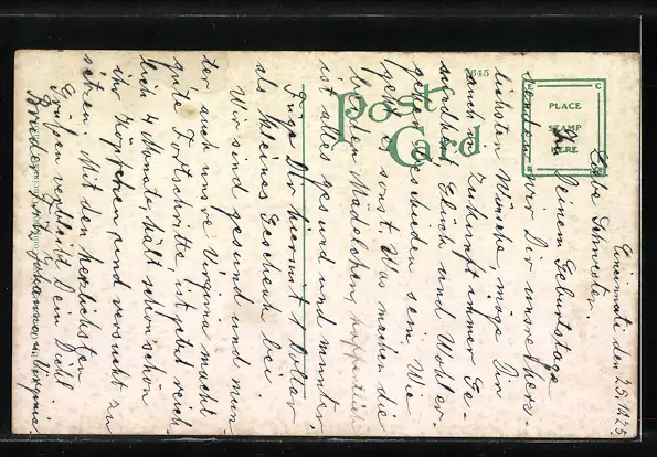 Personenbezogene Daten auf der Rückseite der Karte wurden durch blauen Textmarker unkenntlich gemacht. Die blauen Stellen sind auf die Vorderseite durchgeweicht und wirken sich negativ auf das Postkartenfoto aus