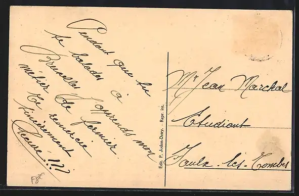 Personenbezogene Daten auf der Rückseite der Karte wurden durch blauen Textmarker unkenntlich gemacht. Die blauen Stellen sind auf die Vorderseite durchgeweicht und wirken sich negativ auf das Postkartenfoto aus