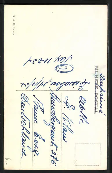 Personenbezogene Daten auf der Rückseite der Karte wurden durch blauen Textmarker unkenntlich gemacht. Die blauen Stellen sind auf die Vorderseite durchgeweicht und wirken sich negativ auf das Postkartenfoto aus