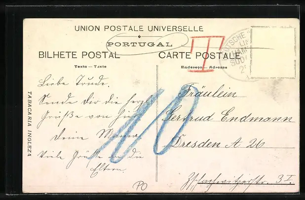 Personenbezogene Daten auf der Rückseite der Karte wurden durch blauen Textmarker unkenntlich gemacht. Die blauen Stellen sind auf die Vorderseite durchgeweicht und wirken sich negativ auf das Postkartenfoto aus