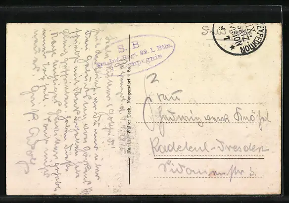 Personenbezogene Daten auf der Rückseite der Karte wurden durch blauen Textmarker unkenntlich gemacht. Die blauen Stellen sind auf die Vorderseite durchgeweicht und wirken sich negativ auf das Postkartenfoto aus