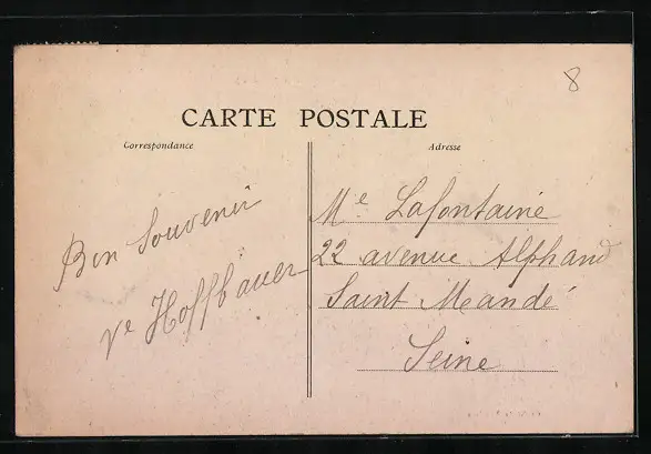 Personenbezogene Daten auf der Rückseite der Karte wurden durch blauen Textmarker unkenntlich gemacht. Die blauen Stellen sind auf die Vorderseite durchgeweicht und wirken sich negativ auf das Postkartenfoto aus