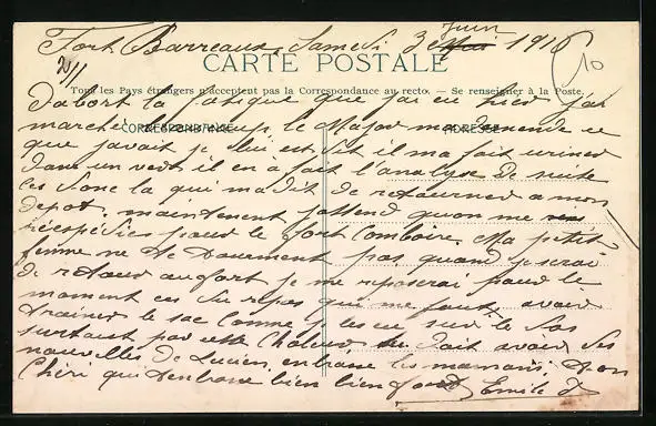Personenbezogene Daten auf der Rückseite der Karte wurden durch blauen Textmarker unkenntlich gemacht. Die blauen Stellen sind auf die Vorderseite durchgeweicht und wirken sich negativ auf das Postkartenfoto aus