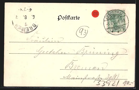gelaufen 1902, rückseitig Klebe- und Papierreste, guter Zustand