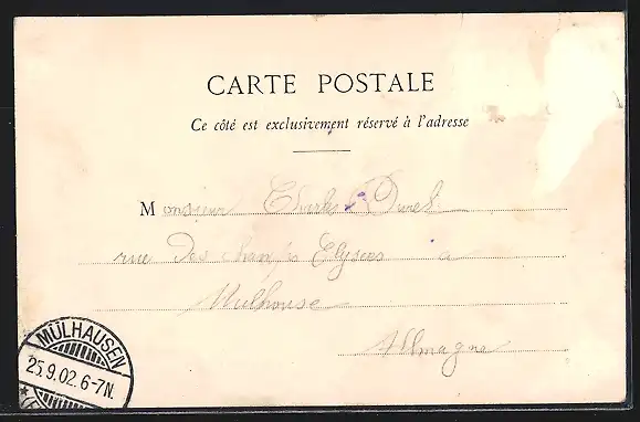 gelaufen 1902, Briefmarke entfernt, rückseitig Oberflächenschaden, Eckknick unten re., Stempelspur, guter Zustand