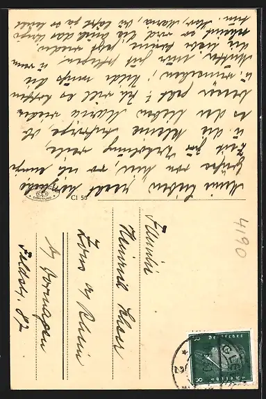 Personenbezogene Daten auf der Rückseite der Karte wurden durch blauen Textmarker unkenntlich gemacht. Die blauen Stellen sind auf die Vorderseite durchgeweicht und wirken sich negativ auf das Postkartenfoto aus