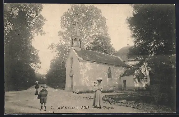 AK Clichy-sous-Bois, La Chapelle entourée d`arbres et de passants