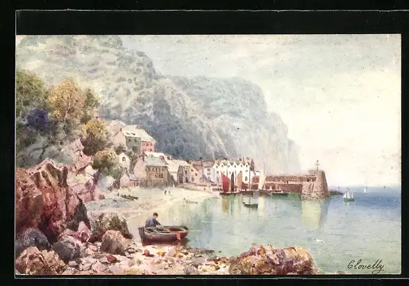 AK Clovelly, Teilansicht mit Pier, Uferpartie und Felsen, Ruderboot