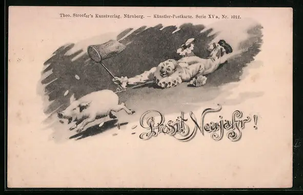 AK Clown fängt Ferkel mit einem Kescher, Neujahrsgruss