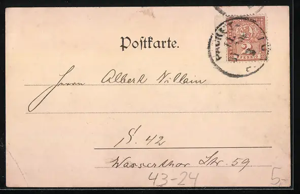 Personenbezogene Daten auf der Rückseite der Karte wurden durch blauen Textmarker unkenntlich gemacht. Die blauen Stellen sind auf die Vorderseite durchgeweicht und wirken sich negativ auf das Postkartenfoto aus