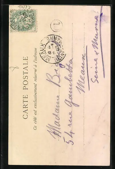 Personenbezogene Daten auf der Rückseite der Karte wurden durch blauen Textmarker unkenntlich gemacht. Die blauen Stellen sind auf die Vorderseite durchgeweicht und wirken sich negativ auf das Postkartenfoto aus