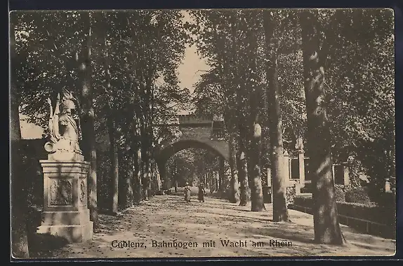 AK Coblenz, Bahnbogen mit Wacht am Rhein