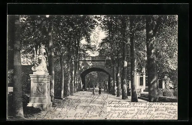 AK Coblenz, Bahnbogen und Wacht am Rhein