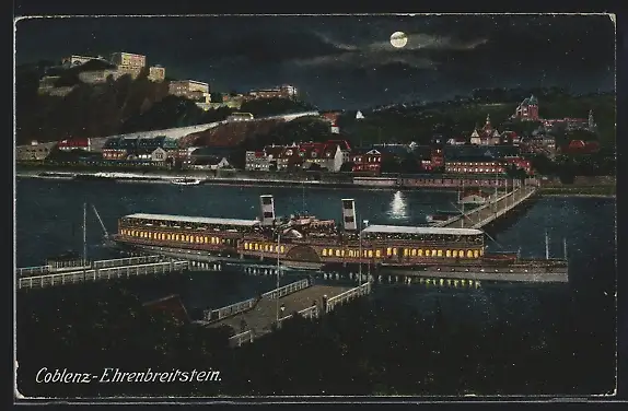 AK Coblenz-Ehrenbreitstein, Uferpartie mit Dampfer bei Mondschein