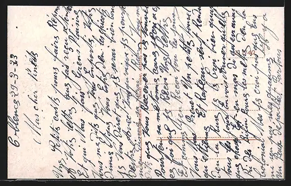 Personenbezogene Daten auf der Rückseite der Karte wurden durch blauen Textmarker unkenntlich gemacht. Die blauen Stellen sind auf die Vorderseite durchgeweicht und wirken sich negativ auf das Postkartenfoto aus