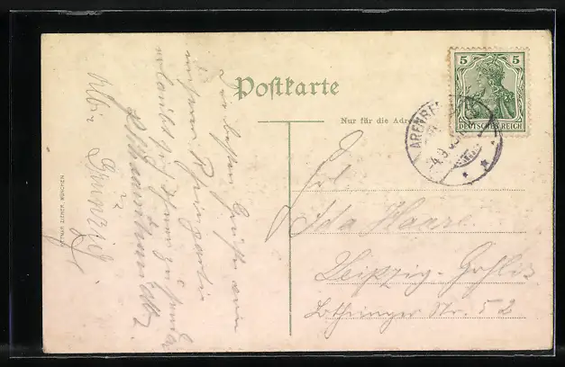 Personenbezogene Daten auf der Rückseite der Karte wurden durch blauen Textmarker unkenntlich gemacht. Die blauen Stellen sind auf die Vorderseite durchgeweicht und wirken sich negativ auf das Postkartenfoto aus