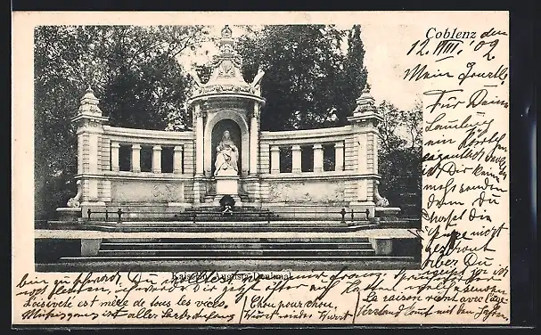 AK Coblenz, Kaiserin Augusta-Denkmal mit Kranz