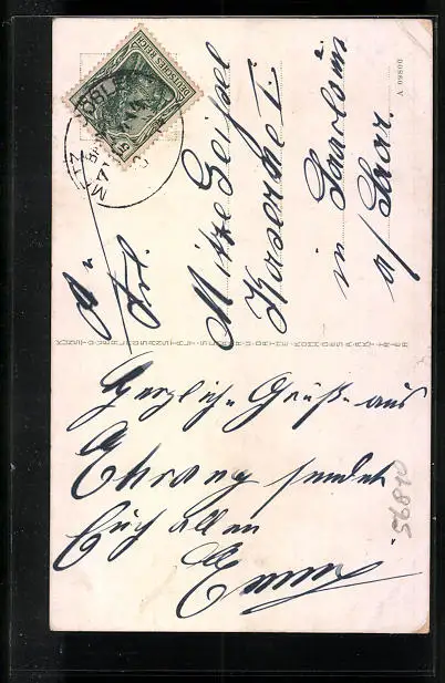 Personenbezogene Daten auf der Rückseite der Karte wurden durch blauen Textmarker unkenntlich gemacht. Die blauen Stellen sind auf die Vorderseite durchgeweicht und wirken sich negativ auf das Postkartenfoto aus