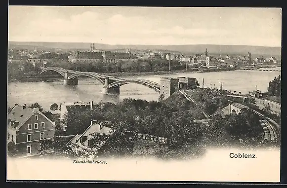 AK Coblenz, Ortsansicht mit Eisenbahnbrücke aus der Vogelschau