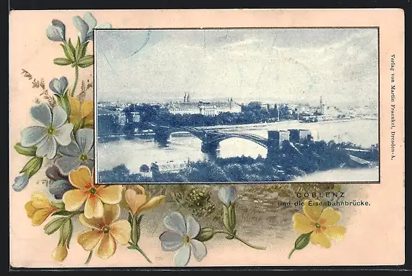 AK Coblenz, Teilansicht mit Eisenbahnbrücke, Blumen, Passepartout