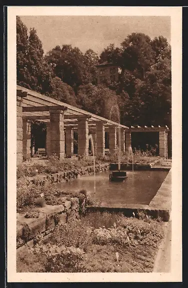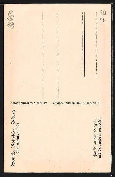 AK Coburg, Deutsche Rosenschau 1929, Partie an der Pergola mit Springbrunnenbecken