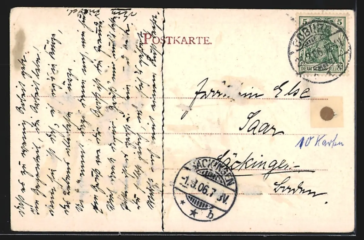 alte Ansichtskarte, gelaufen 1906, rückseitig Klebe- und Papierreste, Eckknick oben rechts, geklebte Lochung li. mittig