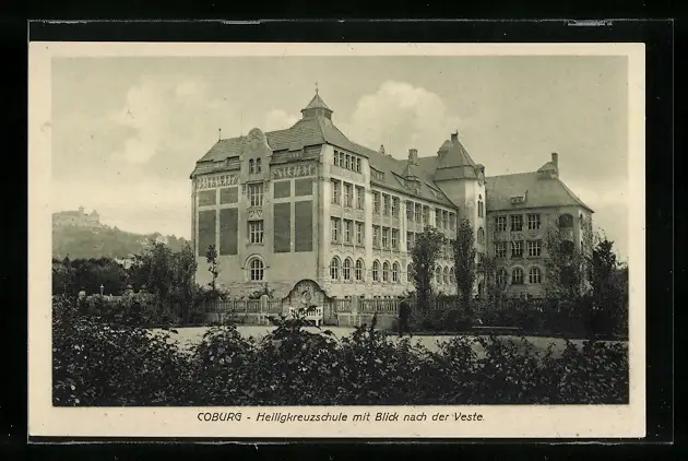 AK Coburg, Heiligkreuzschule mit Blick nach der Veste