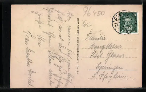 Personenbezogene Daten auf der Rückseite der Karte wurden durch blauen Textmarker unkenntlich gemacht. Die blauen Stellen sind auf die Vorderseite durchgeweicht und wirken sich negativ auf das Postkartenfoto aus