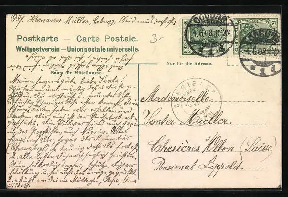alte Ansichtskarte, gelaufen 1908, Eckknick li. unten, Stempelspur, guter Zustand