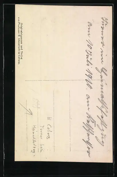 Personenbezogene Daten auf der Rückseite der Karte wurden durch blauen Textmarker unkenntlich gemacht. Die blauen Stellen sind auf die Vorderseite durchgeweicht und wirken sich negativ auf das Postkartenfoto aus