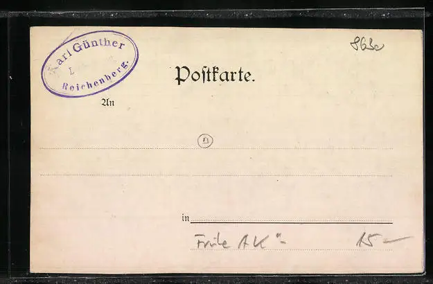 Personenbezogene Daten auf der Rückseite der Karte wurden durch blauen Textmarker unkenntlich gemacht. Die blauen Stellen sind auf die Vorderseite durchgeweicht und wirken sich negativ auf das Postkartenfoto aus
