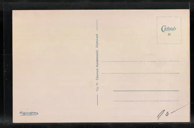 Personenbezogene Daten auf der Rückseite der Karte wurden durch blauen Textmarker unkenntlich gemacht. Die blauen Stellen sind auf die Vorderseite durchgeweicht und wirken sich negativ auf das Postkartenfoto aus