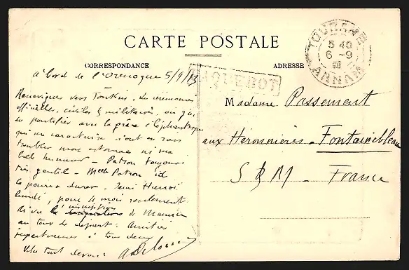 Personenbezogene Daten auf der Rückseite der Karte wurden durch blauen Textmarker unkenntlich gemacht. Die blauen Stellen sind auf die Vorderseite durchgeweicht und wirken sich negativ auf das Postkartenfoto aus