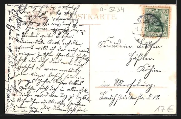 Personenbezogene Daten auf der Rückseite der Karte wurden durch blauen Textmarker unkenntlich gemacht. Die blauen Stellen sind auf die Vorderseite durchgeweicht und wirken sich negativ auf das Postkartenfoto aus