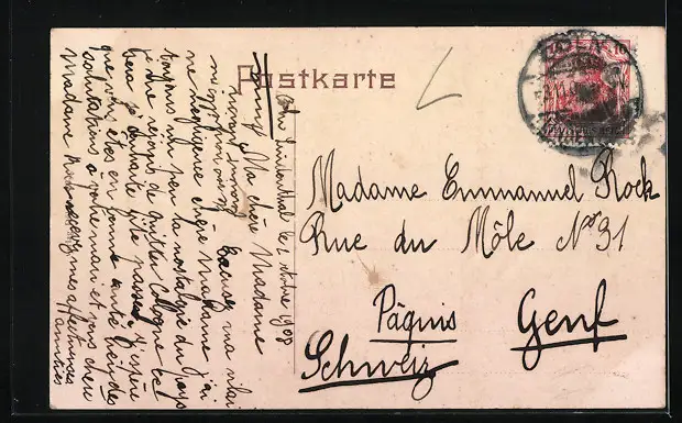 Personenbezogene Daten auf der Rückseite der Karte wurden durch blauen Textmarker unkenntlich gemacht. Die blauen Stellen sind auf die Vorderseite durchgeweicht und wirken sich negativ auf das Postkartenfoto aus