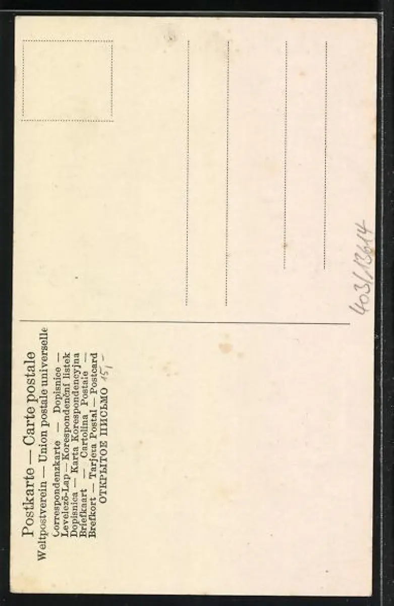 Personenbezogene Daten auf der Rückseite der Karte wurden durch blauen Textmarker unkenntlich gemacht. Die blauen Stellen sind auf die Vorderseite durchgeweicht und wirken sich negativ auf das Postkartenfoto aus