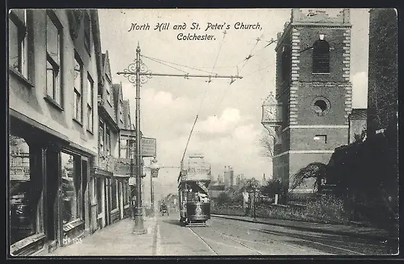 AK Colchester, North Hill and St. Peter`s Church, Strassenbahn