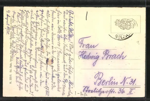 Personenbezogene Daten auf der Rückseite der Karte wurden durch blauen Textmarker unkenntlich gemacht. Die blauen Stellen sind auf die Vorderseite durchgeweicht und wirken sich negativ auf das Postkartenfoto aus