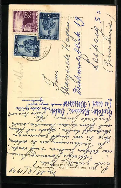 Personenbezogene Daten auf der Rückseite der Karte wurden durch blauen Textmarker unkenntlich gemacht. Die blauen Stellen sind auf die Vorderseite durchgeweicht und wirken sich negativ auf das Postkartenfoto aus